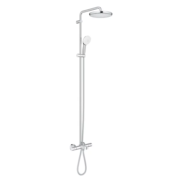 Coloana de dus cu pipa cada design modern Grohe Tempesta Cosmopolitan 250 termostatica.Sistemul include baterie de cada si dus termostatica, brat si palarie de dus fix, para de dus si furtun de dus.