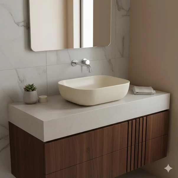 Cele mai populare materiale sunt: - Ceramica sanitară – rezistentă, ușor de curățat și cu aspect lucios clasic; este cea mai folosită opțiune. - Compozitul (marmură compozită, mineralmarmură, solid surface) – oferă un aspect elegant, mat sau satinat, fiind foarte rezistent la pete. - Piatra naturală – spectaculoasă vizual, dar necesită întreținere atentă și impermeabilizare periodică. - Cimentul sau rășina – moderne și versatile, potrivite pentru băi contemporane. Alegerea depinde de buget, stil și nivelul de întreținere dorit.