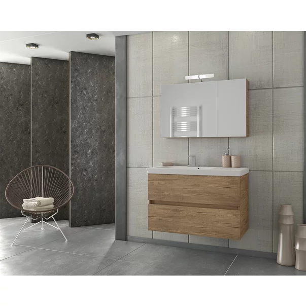 Set dulap baza suspendat maro in finisaj lemn cu doua sertare si lavoar alb cu orificiu baterie si preaplin Drop Luxus 85 cm, design modern.