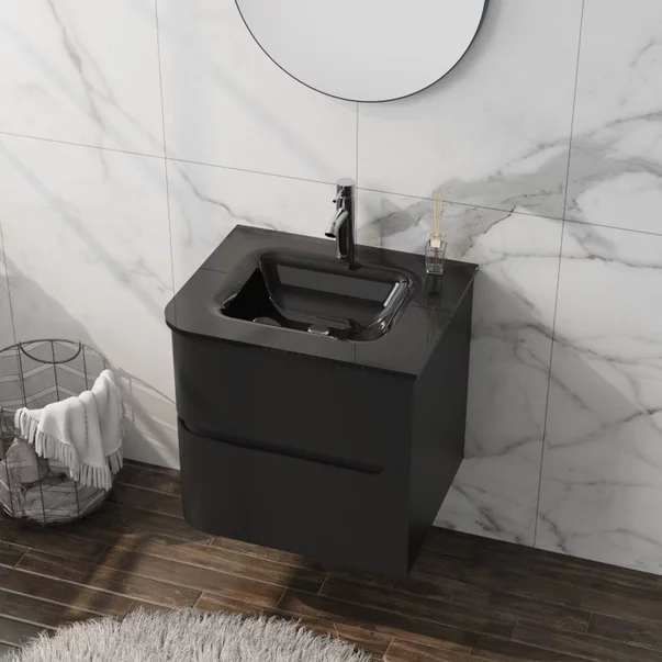 Set dulap baza suspendat Rune Jorunn 2 sertare 60 cm negru mat si lavoar negru