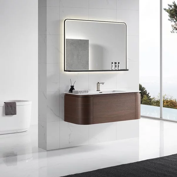 Set dulap baza suspendat Rune Sowilo 3 sertare 100 cm finisaj lemn inchis si lavoar alb